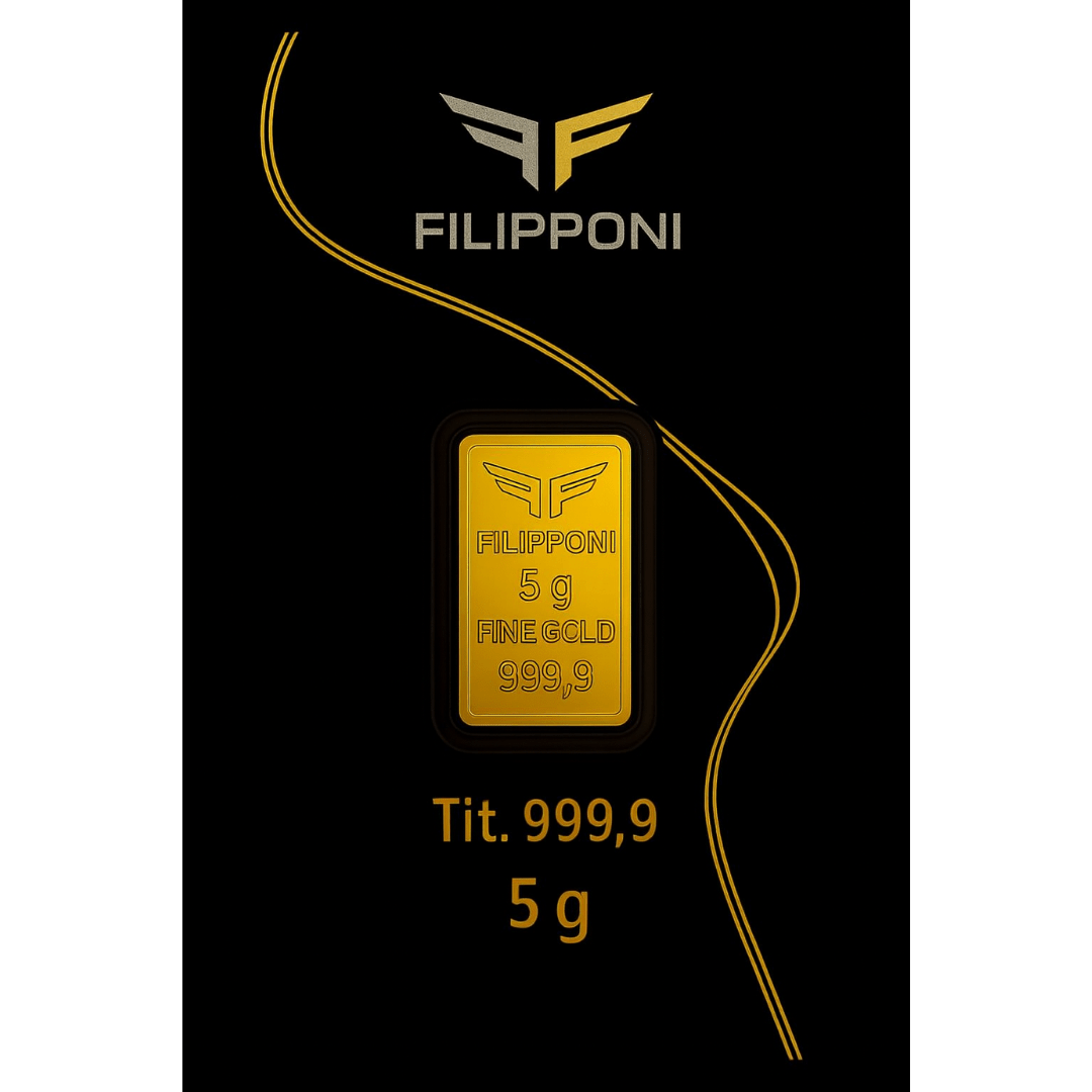 Lingotto d’oro da G 5,00 prodotto dalla Filipponi & C. Srl, delle dimensioni di 22x14x1 mm e dalla purezza pari a 999,9 parti su mille di oro puro. Il lingotto è conservato in un’elegante confezione recante il logo Filipponi.