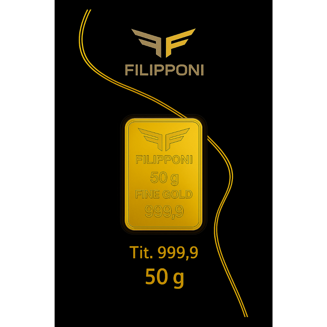 Lingotto d’oro da G 50,00 prodotto dalla Filipponi & C. Srl, delle dimensioni di 50x29x2 mm e dalla purezza pari a 999,9 parti su mille di oro puro. Il lingotto è conservato in un’elegante confezione recante il logo Filipponi.